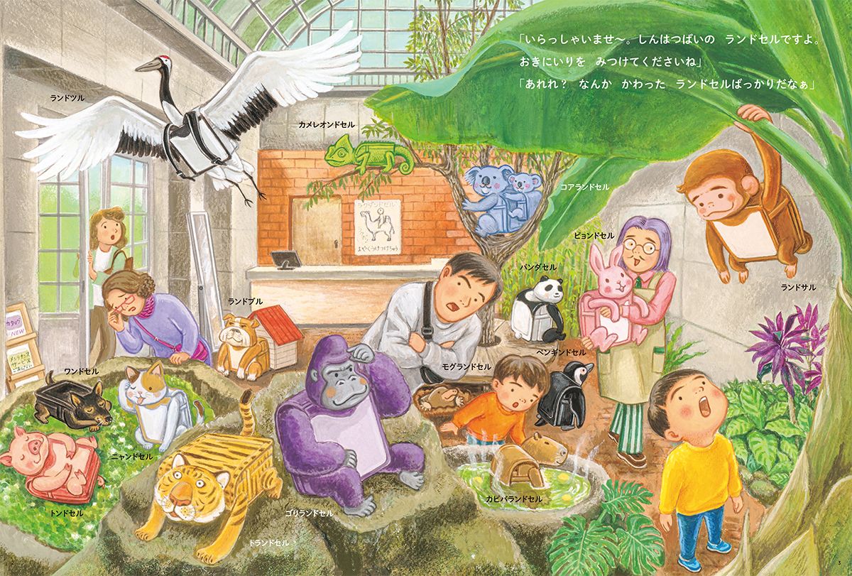 お店のなかはまるでジャングルで、動物型の変わったランドセルがいっぱい。忘れ物をしないようにしっぽで取ってくれる「ランドサル」、落とし物を探すのが得意な「ワンドセル」、寒いときには湯たんぽ替わりになってくれる「ニャンドセル」……。