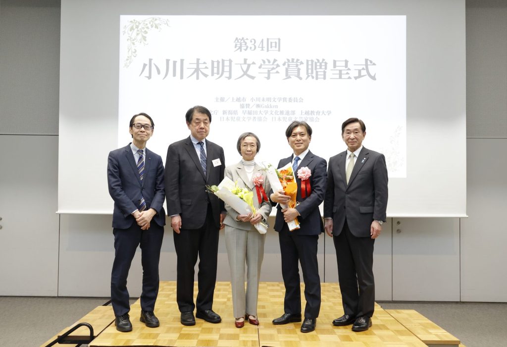 左から、株式会社Gakken・橋本邦彦副社長、小川未明文学賞委員会・宮川健郎会長、大賞受賞者・樹 あゆり氏、優秀賞受賞者・隅垣 健氏、上越市・小菅淳一市長。