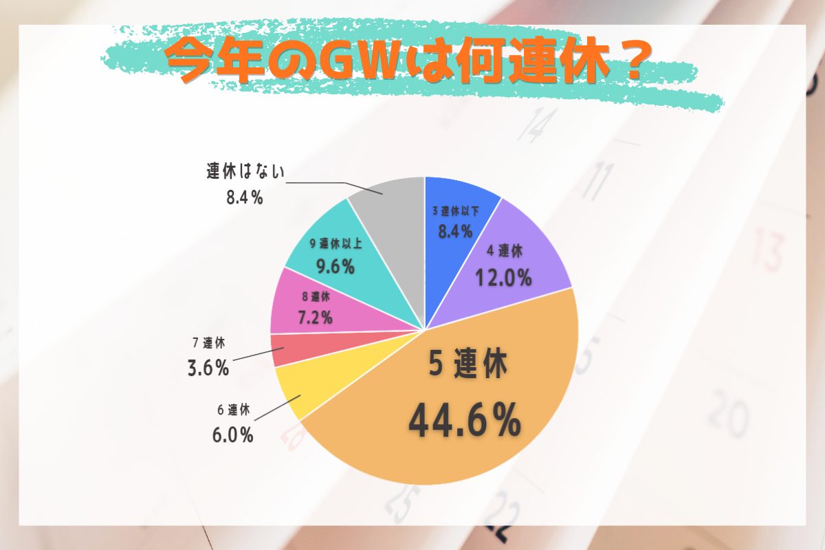 カレンダー通り土・日・祝を休むと5連休カレンダーの土・日・祝に加えて4月30日(木)と5月1日(金)を休むと8連休になりますが、実際のところ、みなさんどのくらい休めるのでしょうか。アンケートで聞いてみました。