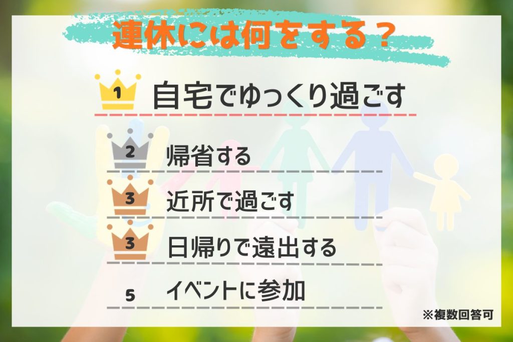 3位には「近所で過ごす」「日帰りで遠出する」が同率ランクイン、5位は「イベント、お祭りなどに参加する」という結果になりました。ゴールデンウィークは地域のイベントも多く、家族で楽しめる場所も多いので、どこに行こうか迷ってしまいますね。