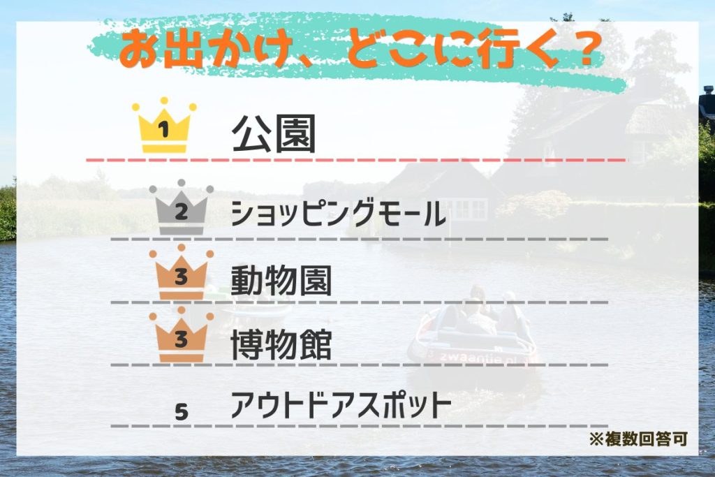 お出かけをすると回答した方に、「ゴールデンウィークに行く予定の場所」を聞いたところ、1位は「公園」。行きなれている公園で連休も過ごす、もしくは少し遠くて大きな公園に行くというご家庭が多いようです。