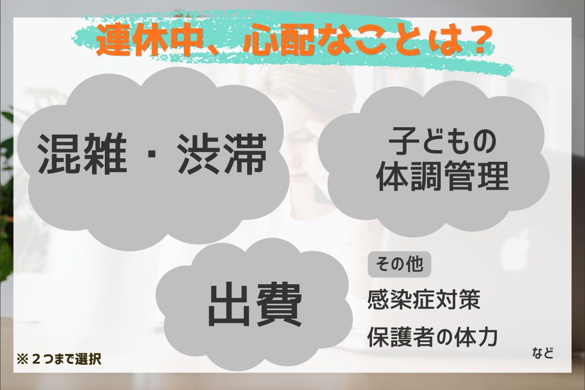 一方、せっかく予定を立てても、当日の体調次第ではあきらめざるを得ないことも……。2位は「子どもの体調管理」となりました。連休の前だけではなく、お出かけした後に体調を崩さないかも心配なもの。お出かけ先で感染症にかかってしまわないか心配する人もいました。
