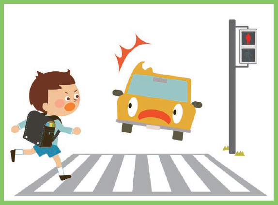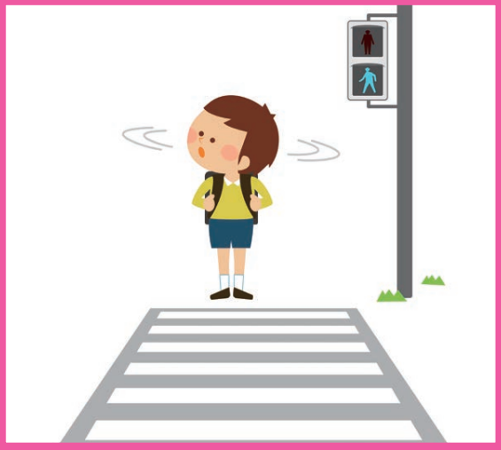 お子さんへのヒント:道路をわたるとき、注意しなければいけないのは何かな?