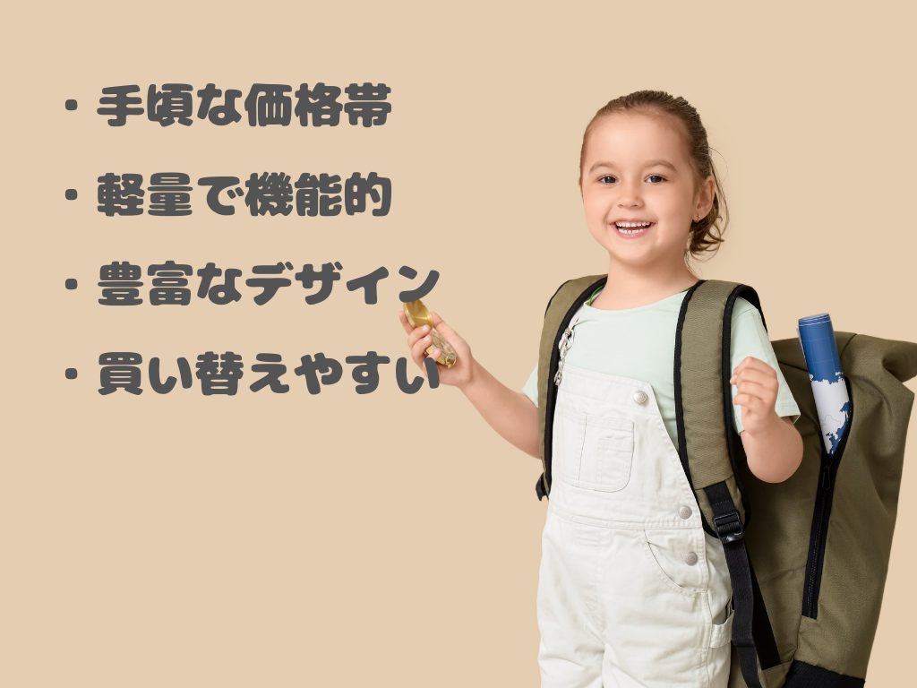 お値段が安く、種類も豊富なため、子どもの成長や生活スタイルの変化に合わせて気軽に買い替えることができます。体の成長によって背中のカーブが合わなくなってきた、幼いころに選んだデザインが子どもっぽく思えるようになってきた、などの悩みに応えられます。