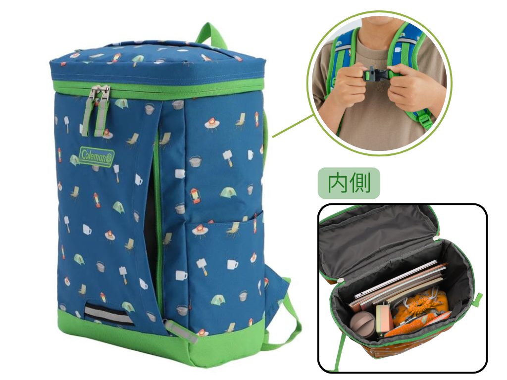 キャンプ用品で有名なColemanのバックパックは、約455gと超軽量設計。上部が蓋のように開くつくりで、中の物が引っかからずに取り出せます。ファスナーの引き手やベルトなど、多方面に反射材が付属しており、暗い時間の下校も安心です。チェストベルトの留め具はいざという時に使えるホイッスルになっており、防犯面への配慮が豊富です。バイカラーのシンプルモデルほか、パステルカラーやキャンプ柄の楽しいデザインなどが、買い足しやすい価格で販売されています。