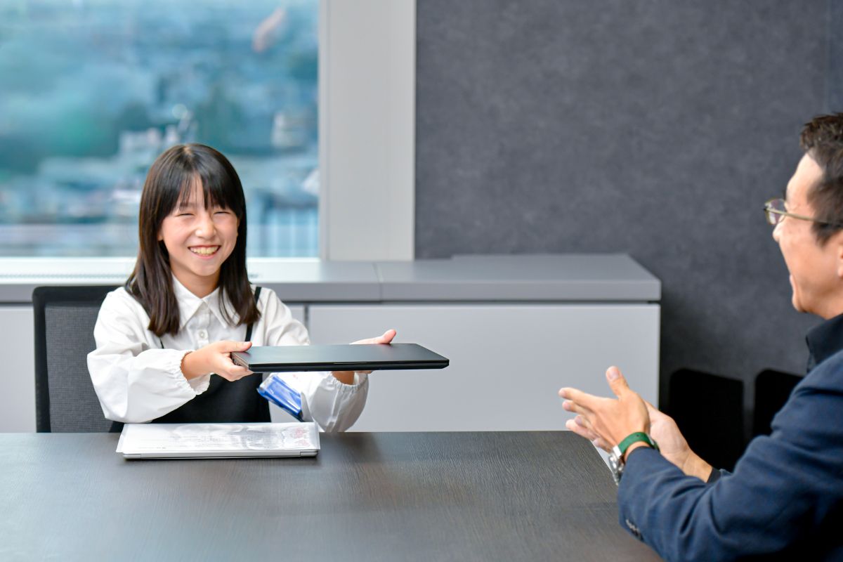 「大隈社長はとてもやさしくて、メガネが似合っていました。社長というとすごく年上の人だと思っていたけど、偉い人というよりも学校の先生のような感じで、緊張している私にもわかりやすく説明をしてくれました。これから、どんなパソコンが登場していくのか楽しみです。子ども向けのパソコンをつくるときは、私もぜひ大隈社長と一緒に考えたいです!」(麻夏さん)