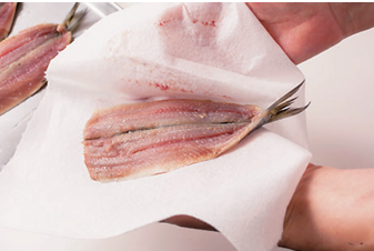 塩をふってしばらくおくと、余分な水分と共に臭みも出てくるので、しっかりふき取る。
