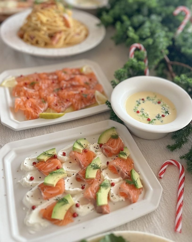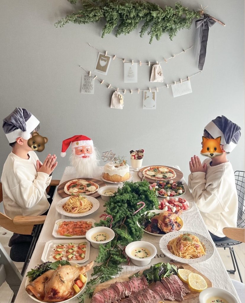 「家族みんなでクリスマスパーティー♪ ローストビーフやサーモンのカルパッチョなど、子どもたちが好きなメニューをそろえたクリスマスごはんです。前日から準備をしました。テーブルにツリーを寝かせ、装飾にもこだわりました」