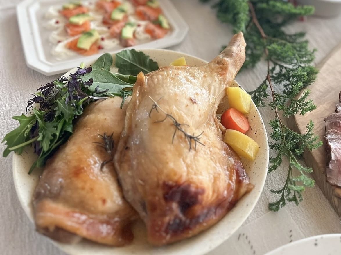 「チキンの丸焼きとグラタンはオーブンにお任せ♪ クリスマスパーティー当日は、バタバタするのを少なくするため、盛り付けるだけでOKのところまで前日に準備。子どもたちには、トナカイのアメリカンドックとポテサラツリーが大好評でした! 」