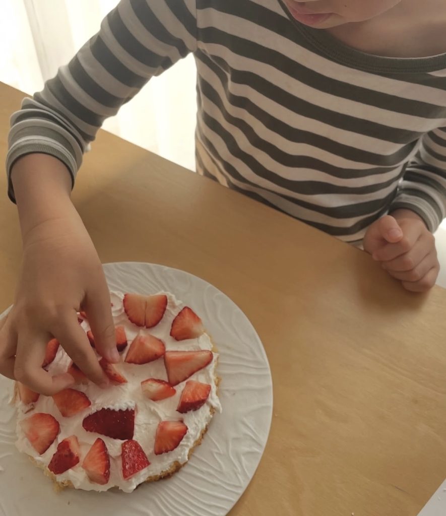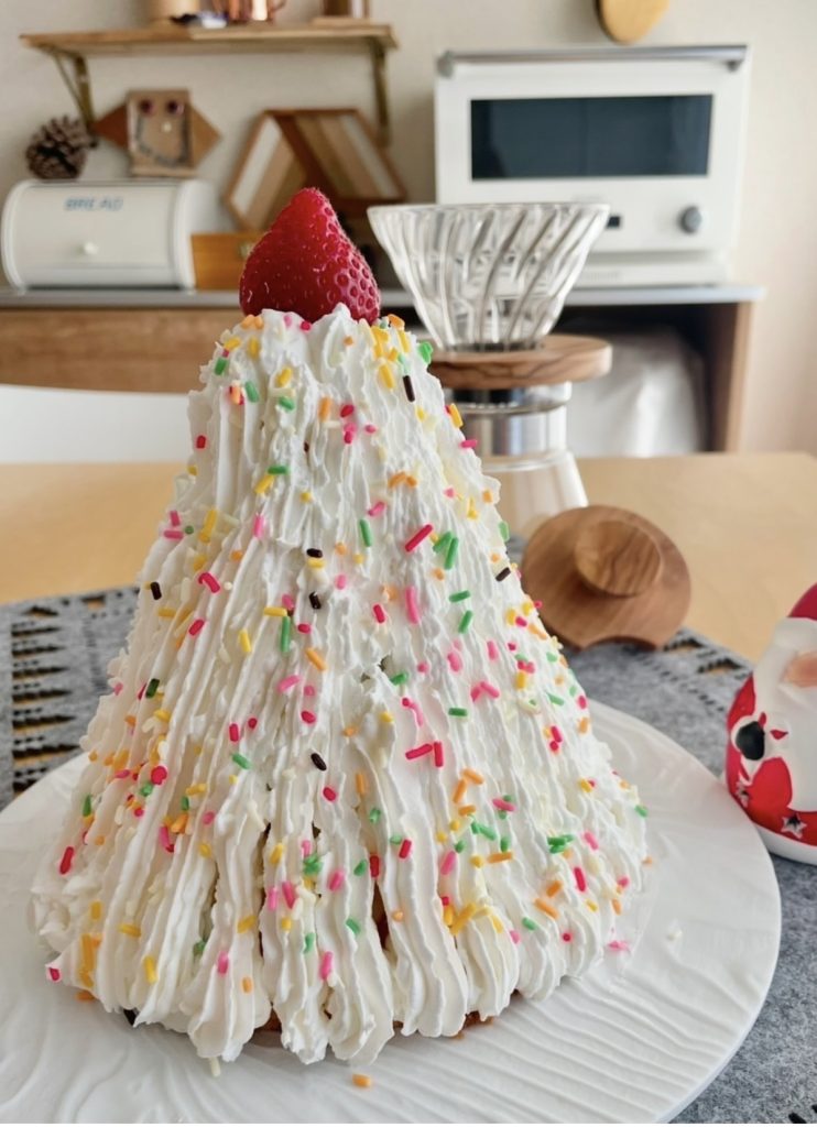 「土台にはスポンジを敷き、その上にクリーム&いちごを盛り付けて、クリームをたっぷり使ったクリスマスツリーケーキ♪ 仕上げにチョコのカラフルスプレーをまぶしてできあがり。姉弟で作ってクリスマスを楽しめました。」