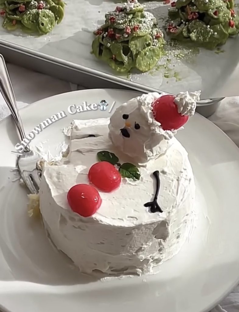 「土台にローソンのロールケーキを2つ重ね、まわりにホイップクリームをたっぷり使い、スノーマンケーキに♪ チェリーと、チョコペンで仕上げをしたらできあがりです」