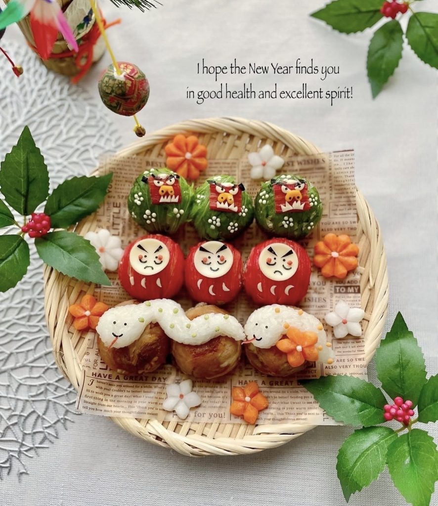「ひと口サイズのおにぎりを❝お正月❞テーマで再現しました♪ 上から獅子舞、だるま、干支(巳)です。カニカマ・チーズ・のり・あられ・水菜などを使っています。干支おにぎりは肉巻きなのでスタミナもたっぷり。見てかわいい♡食べておいしい♡と子どもたちにも大好評です」