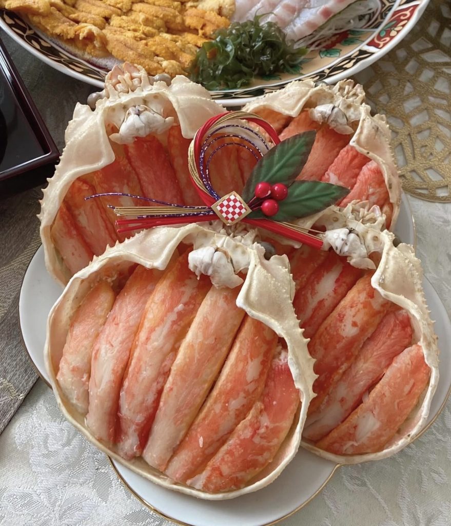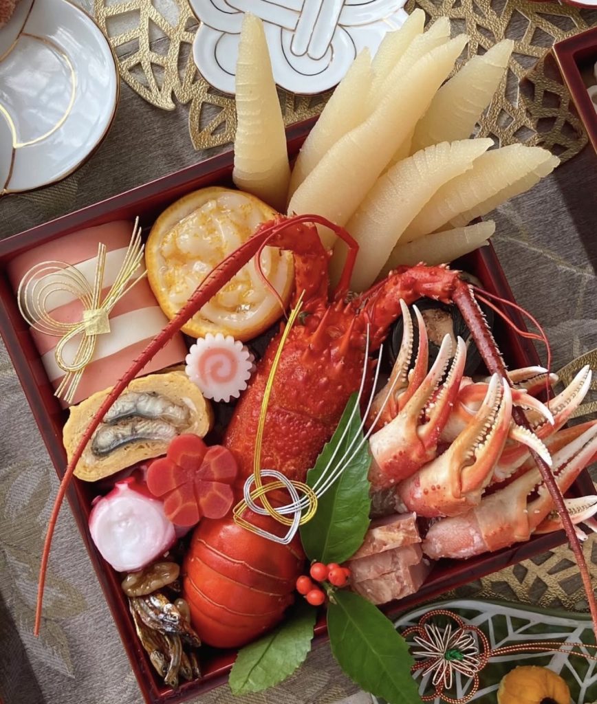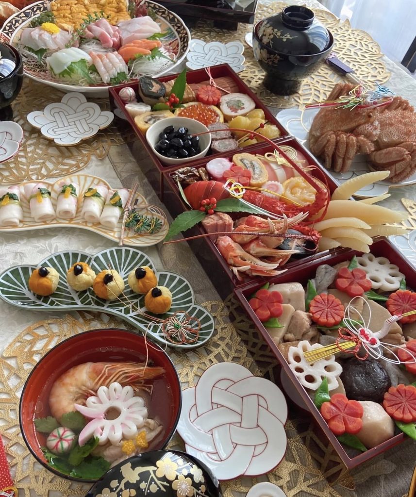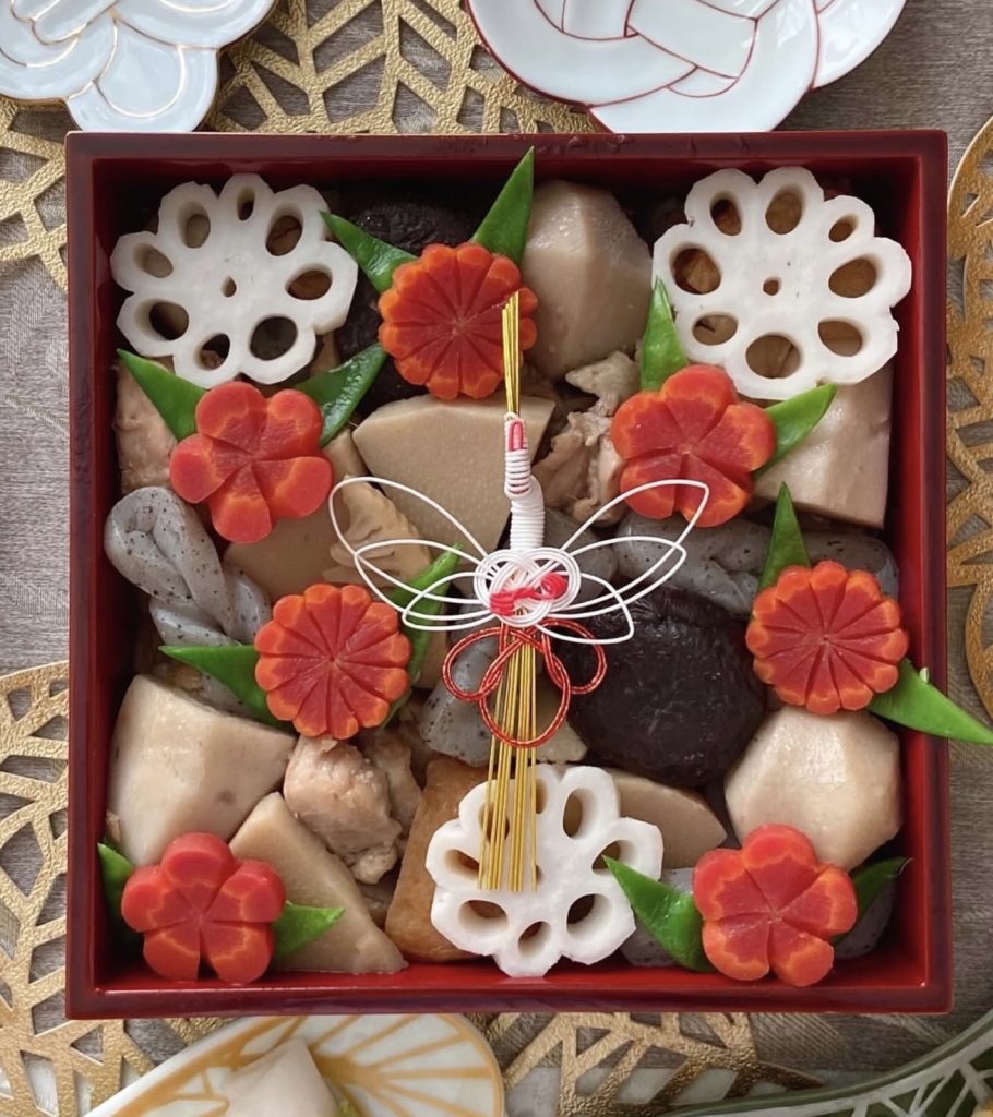 「大晦日、早めに準備に取り掛かりましたが……完成まで徹夜しました! 煮しめのれんこんとにんじんの飾り切りはバリエーションをつけると、より華やかに仕上がります♪ 華やかな気持ちで一年を始められるよう、海鮮をたっぷり使って盛り付けました」