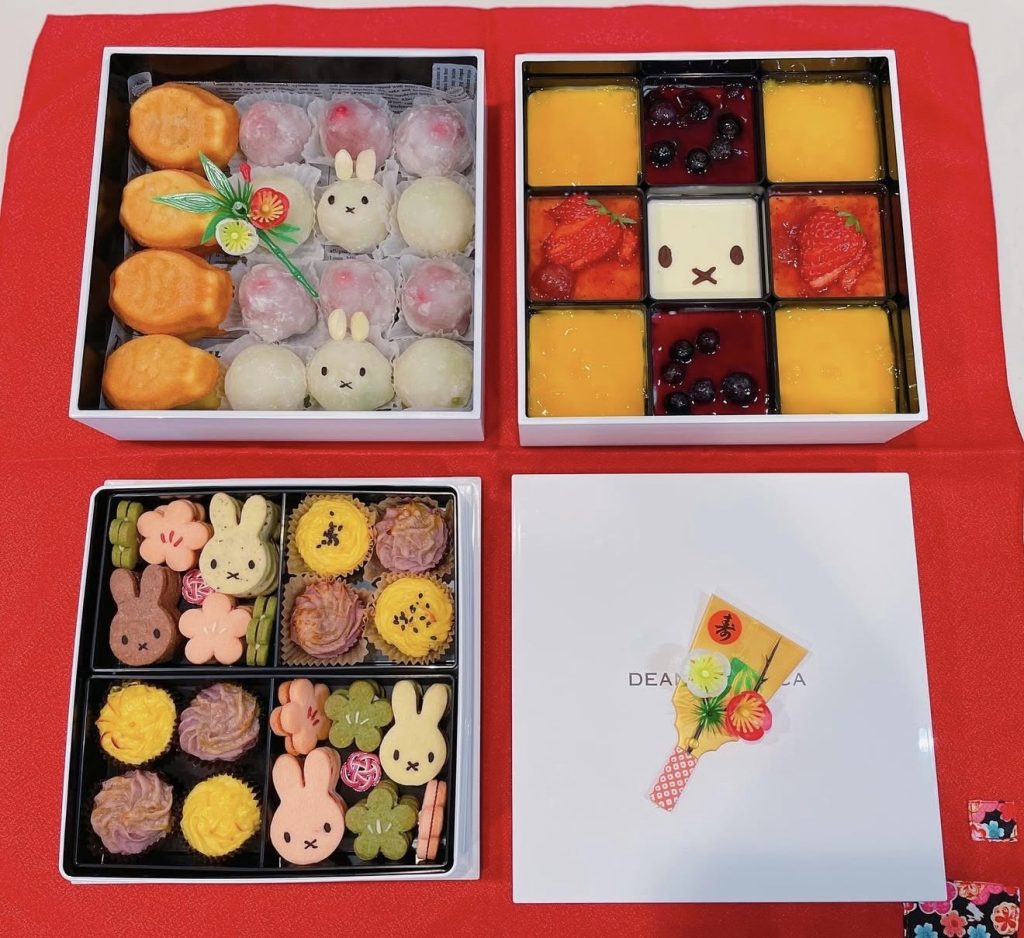 「1段目はマンゴープリン、パンナコッタ(写真右上)、2段目はミニたい焼きマドレーヌ、フルーツ大福(写真左上)、3段目はチョコサンドクッキー、スイートポテト(写真左下)。義父母宅への新年のごあいさつに持参しました♪」
