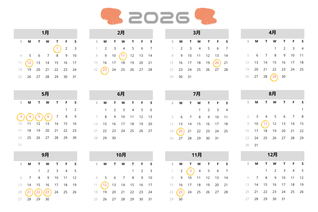 2026年は、土日と合わせて3連休以上になる日が8回あります。