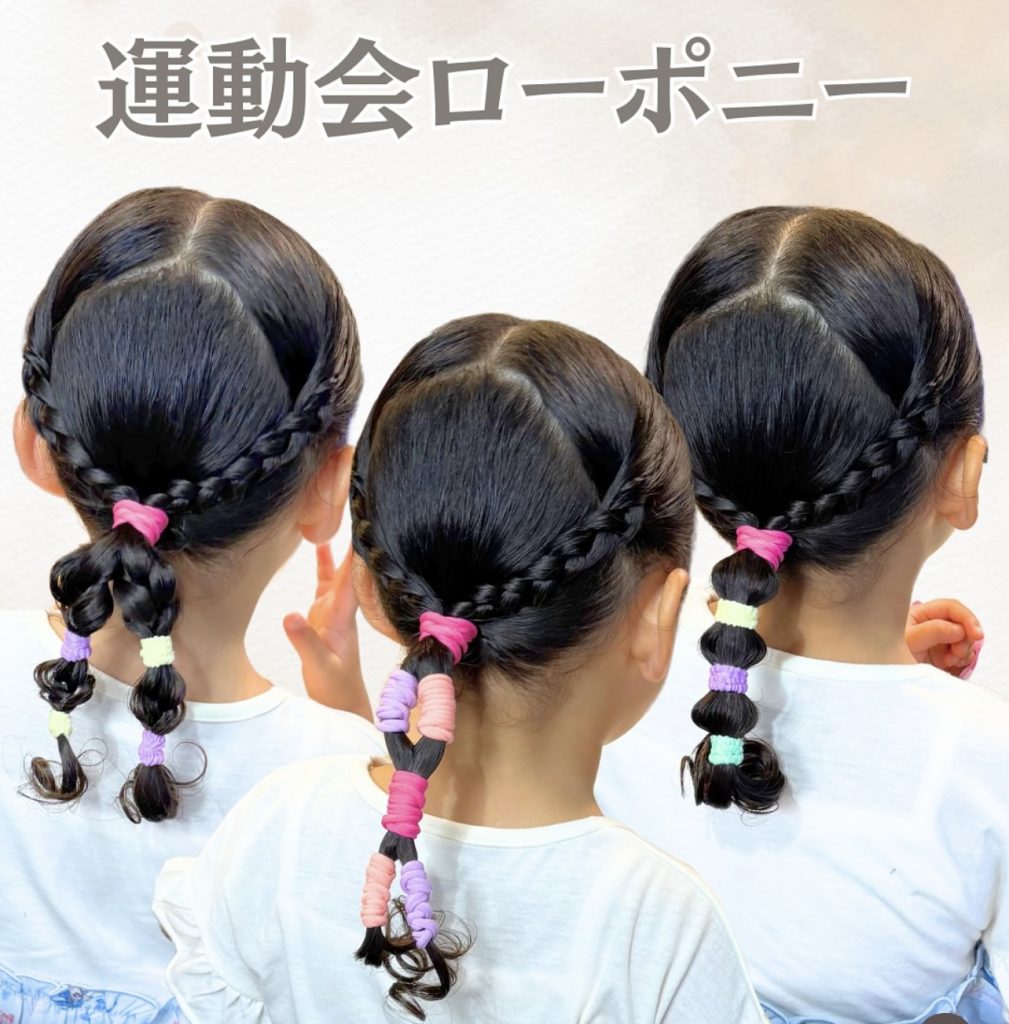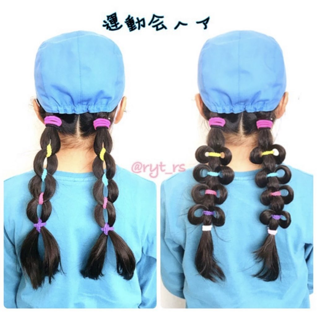 「運動会の朝は時間がないので、ヘアゴムだけでも工夫ひとつでグッとかわいく簡単にまとめられることを、(以下のアレンジ)3つとも意識して作りました♪」
