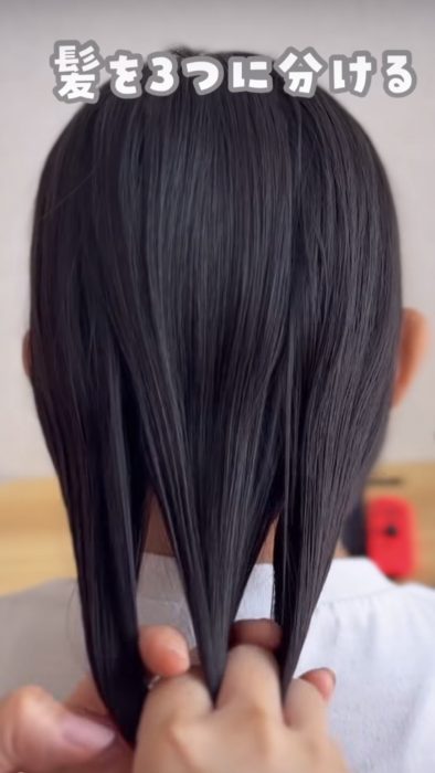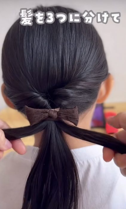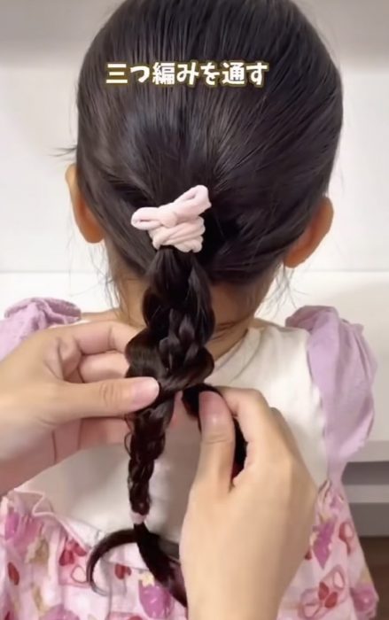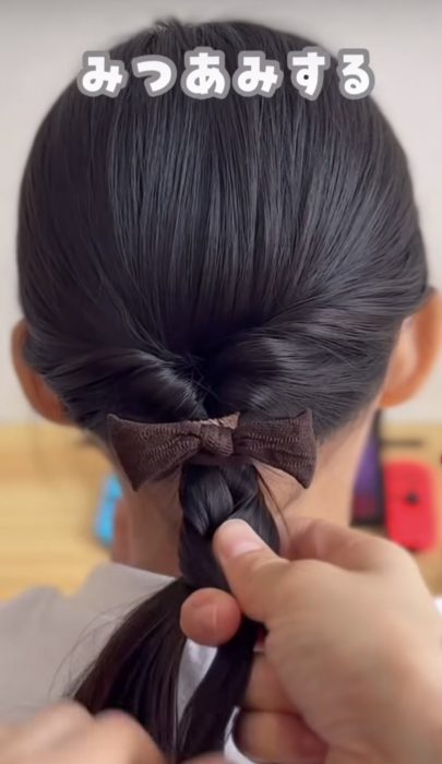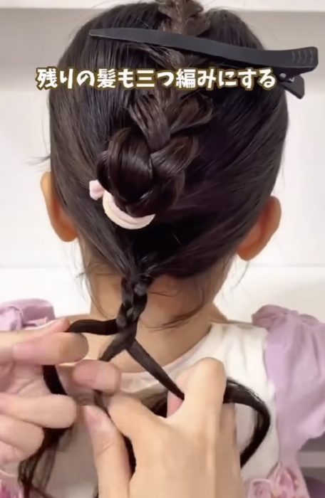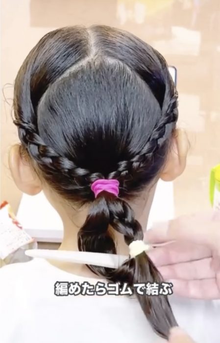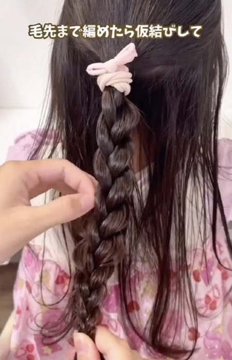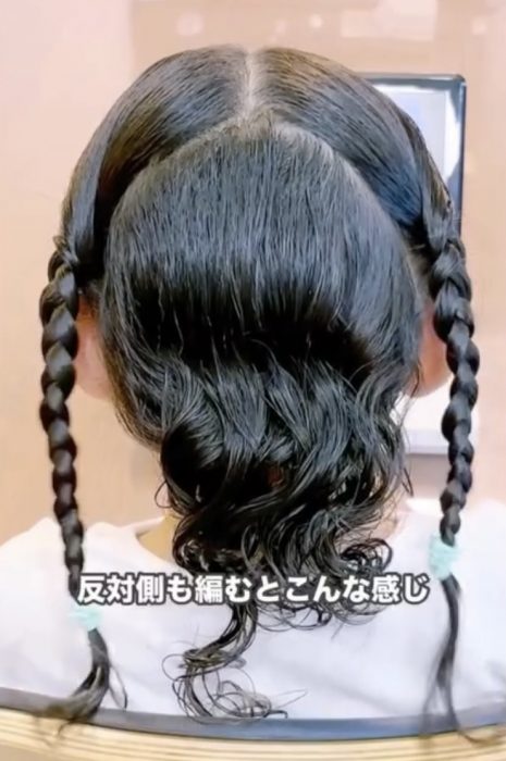まとまった髪を2つに分けてそれぞれ三つ編みにして最後はひとつにまとめて結ぶ