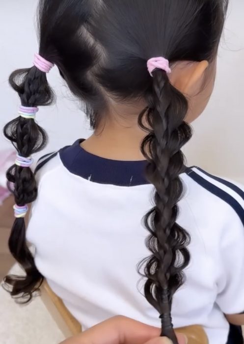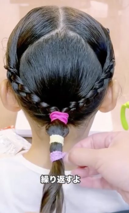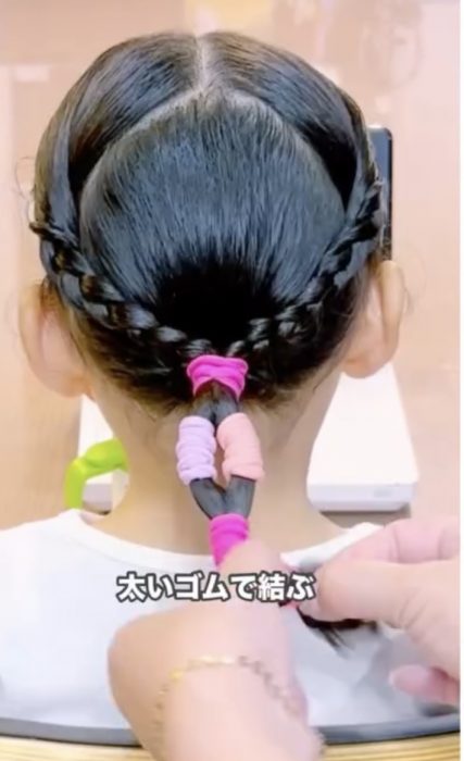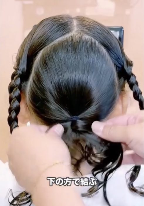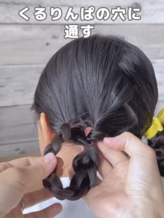 ツインテールにして、毛先まで三つ編みにしてまとめる。三つ編みの結び目をツインテールの根元に通すように輪っかをつくる。ゴムでジグザグにまとめて、最後にツインテールの根元には目立つゴムを使って完成。