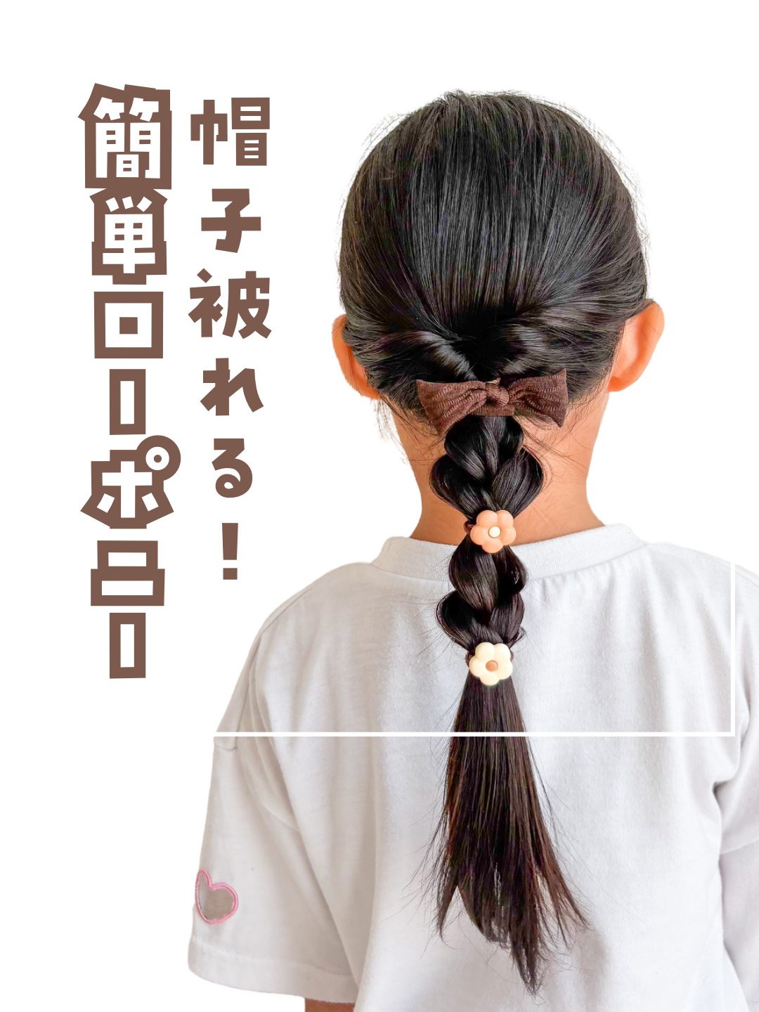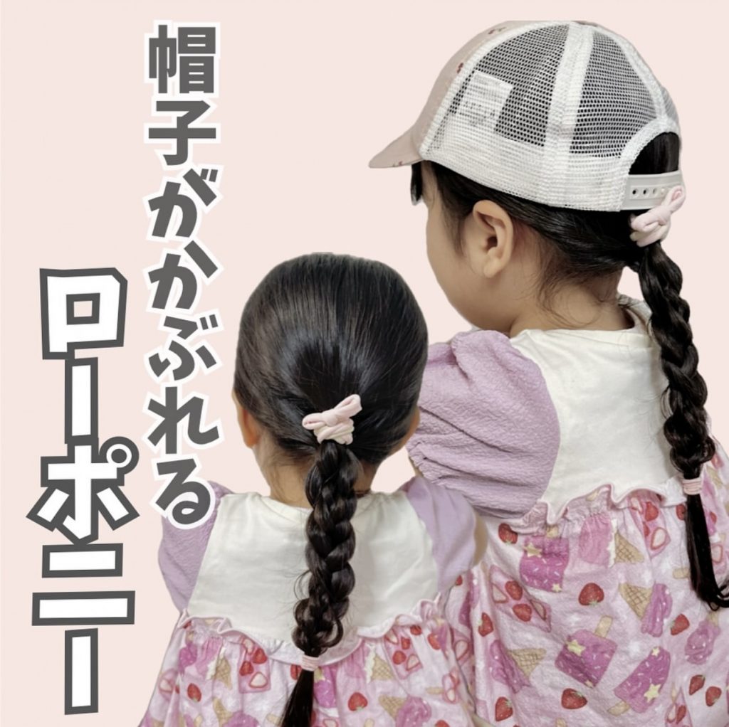 「子どもからは「お姫様みたい♡」と好評なこのローポニーは、3~4分でできちゃう簡単アレンジ。横髪がたるまず、崩れにくいです。帽子をかぶる運動会はもちろん、遠足などにもピッタリ♪」