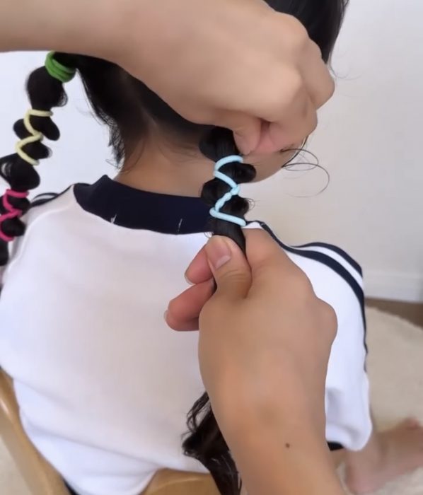 2つに分けた髪を太いゴムでそれぞれ結び、次に2本を1本に太いゴムでまとめる。これを繰り返す