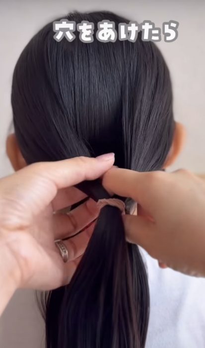 2.真ん中の毛束だけ残して両端の毛束を結び、穴をあけて結んだ毛束を上から通して中に入れる