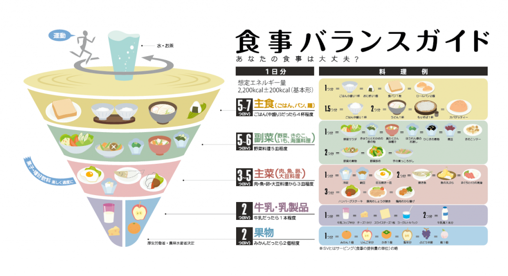 栄養指導では、口をすっぱくして「バランスよく食べましょう」と言ってしまいますが、栄養バランスを見る基準として、平成17年6月に厚生労働省と農林水産省が決定した「食事バランスガイド」があります。学校給食もこれを参考に作られています。