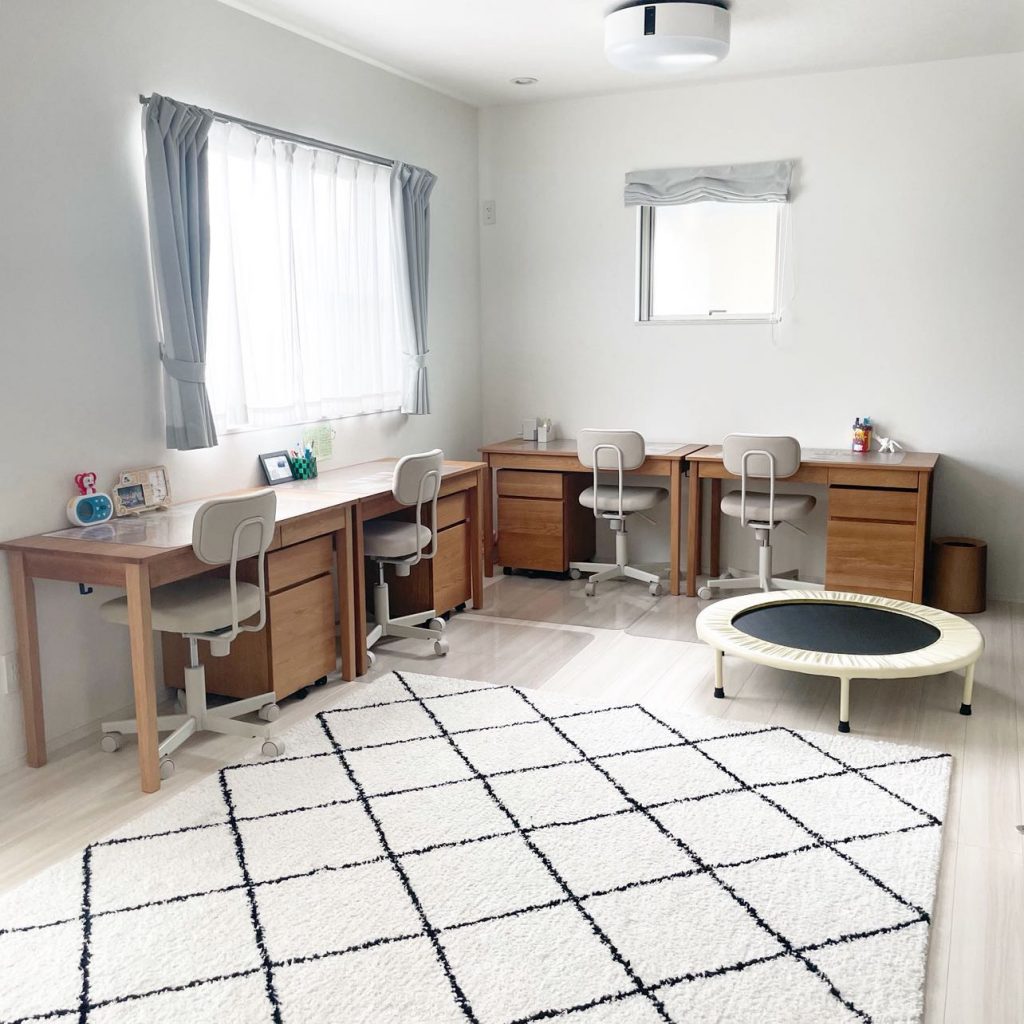 「我が家は4人きょうだいです。子ども部屋には1人1台ずつ学習机を用意。❝自分専用の机❞というのがみんなうれしいようで、場所はとりますが学習へのモチベーションのひとつになっています。引き出しや棚に学用品などを収納し、目に見える部分はなるべく片づけるようにしてすっきりとさせることを心がけています。」(小6三つ子、小4男子)