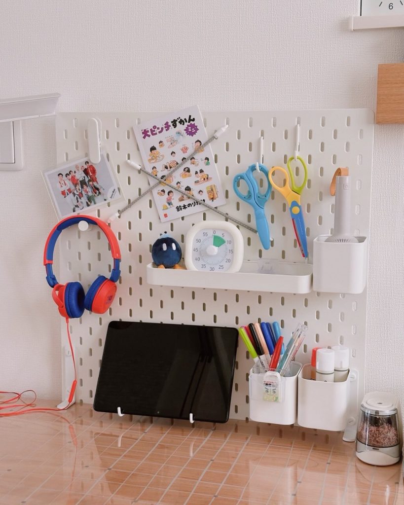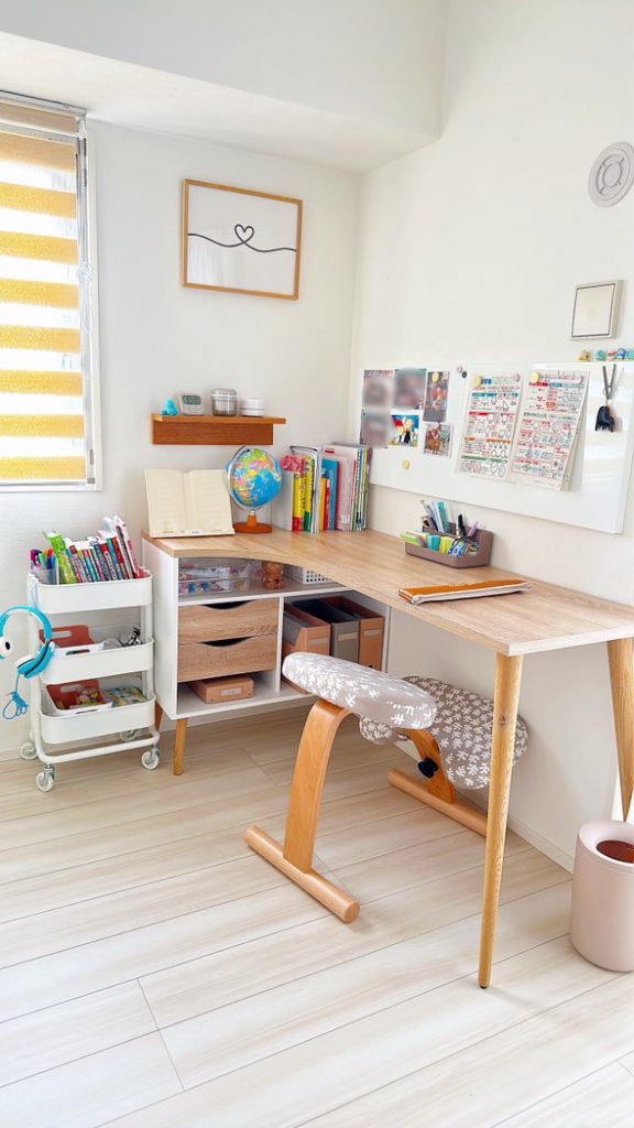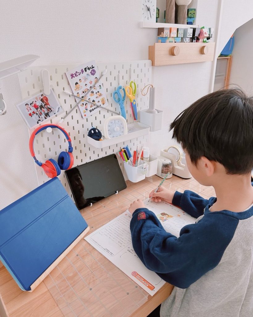 「就学前はダイニングテーブルで学習していたけれども、食事の準備などで中断させることもしばしばあり、小学生になってからはリビングに学習机を置きました。2年生になり、もっと使いやすくなればと、元々あった棚を取り外して小物類はボード収納に。こまごましたものをひと目で管理でき、机の上もすっきりできて◎。子どもが学習にすぐ取り組める、環境づくりって大切!」(小2男子)