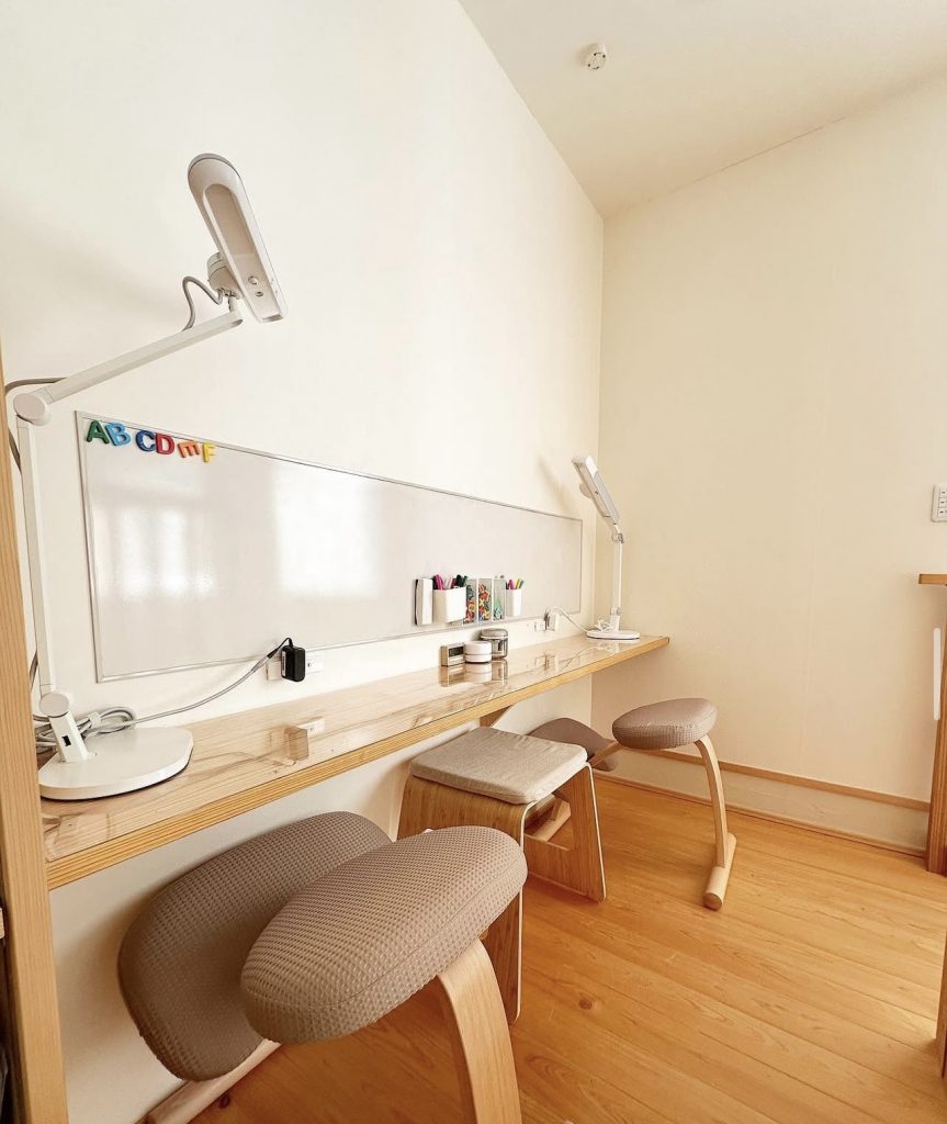 「我が家は戸建てで階段を上がったところにフリースペースがあります。ここを子どもの学習空間にしています。イスは息子と娘、そして横で見守る大人用の3つ。目の前にホワイトボードを設置して、漢字を書いたり、計算問題をいっしょに解いたりしながら、日々学習に活用しています。鉛筆などの文具はマグネットで貼り付けられるケースに収納して、机まわりはすっきりと♪ いっしょに並んで勉強する時間がまた、親子で過ごす楽しい時間にもなっています」(小4男子、小1女子)