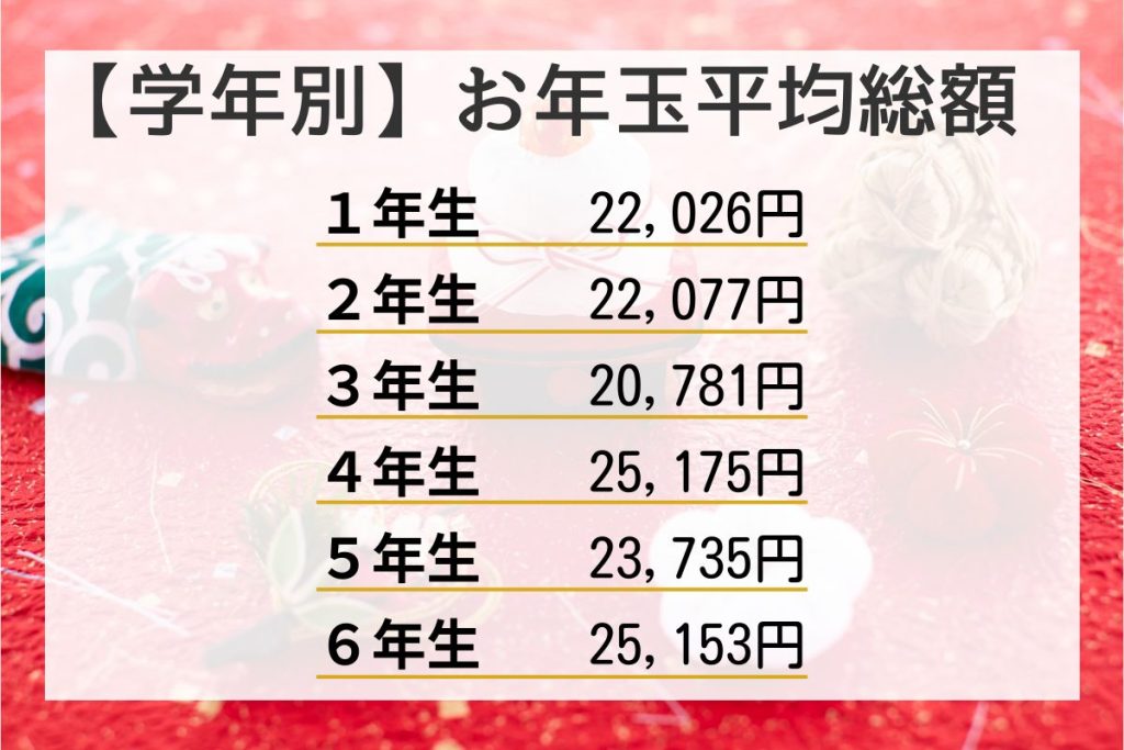 小学生のお年玉の平均総額は全学年で2万円超。学年別の平均総額を見ると、多少のバラつきはありますが、1年生は22,026円、6年生では25,153円と高学年ほど増える傾向です。もはや令和の小学生にとって、2万円以上お年玉をもらうのは「普通」と言えそうです。