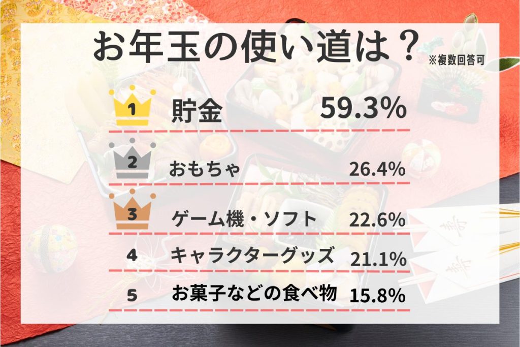 お年玉の使い道として最も多かったのは「貯金」で、59.3%にのぼりました。もらったときに一気に使わず貯金しておくことで、今後本当に欲しいものが見つかったときにすぐ役立てられそうですね。貯金以外では2位「おもちゃ」(26.4%)、3位「ゲーム機・ゲームソフト(オンライン以外)」(22.6%)と、遊び道具を買う子が多い様子。