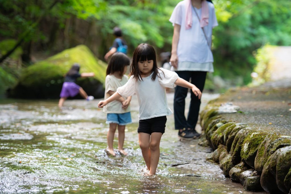こちらも季節限定にはなりますが、夏場の水遊びは楽しいものです。天気がよくても水温は冷たいこともあるので、長時間の水遊びは避けます。水に入る場合は浅瀬でも必ずライフジャケットを着用し、目を離さないこと。大人の膝下くらいの浅瀬で網とバケツを持って、小魚、エビ、サワガニ、虫などを探します。