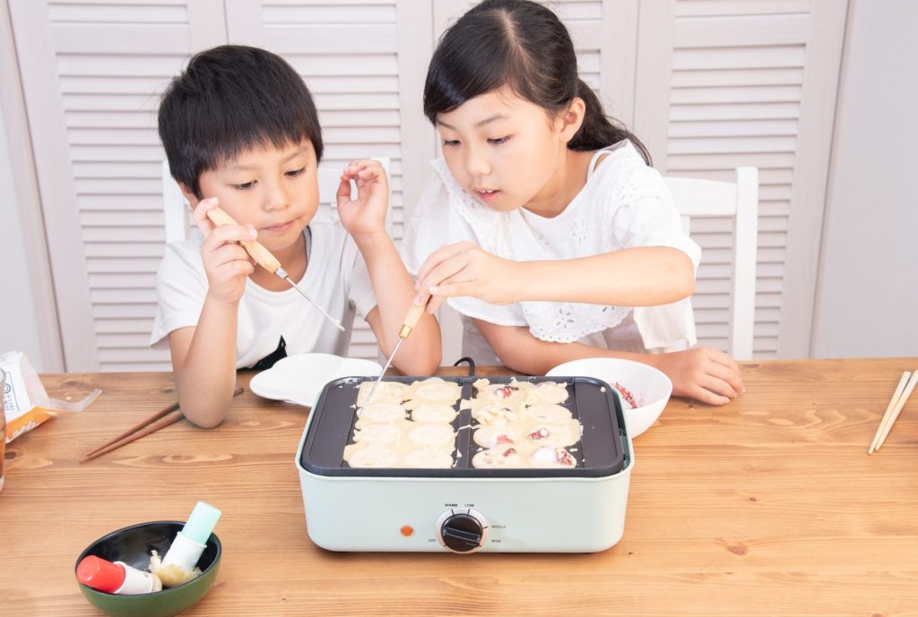 家庭用のたこ焼き器やホットプレートで、たこ焼きパーティーを。市販のたこ焼き粉を使えば、味付けや配合を迷うこともありません。中に入れる具材はベビーチーズやウィンナーなど、簡単なものにするとハードルが下がります。生地にホットケーキミックスを使えばベビーカステラもできます。