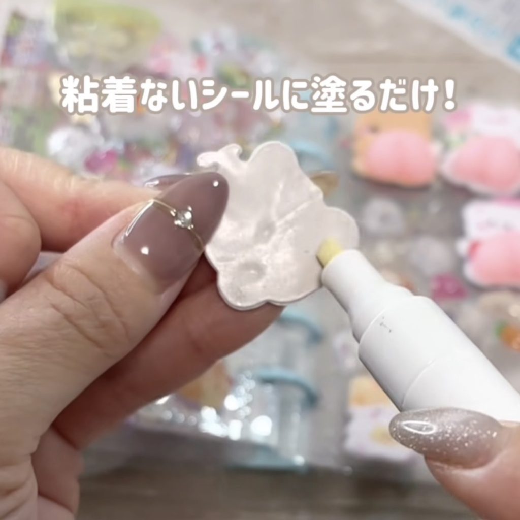 「我が家の娘たちがシール交換を繰り返すうちに、粘着が弱くなってきてしまいました。お気に入りのシールほど、何度も貼り替えたりしていたので、なんとか復活させられないかなと、悩んでいたところ、セリアの❝ふせんが作れるペン❞に出会いました♡ 塗るだけで粘着力が復活! シル活の救世主です♡」
