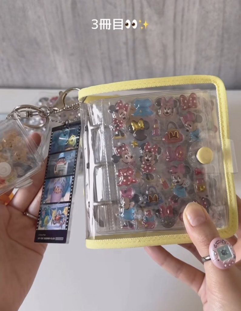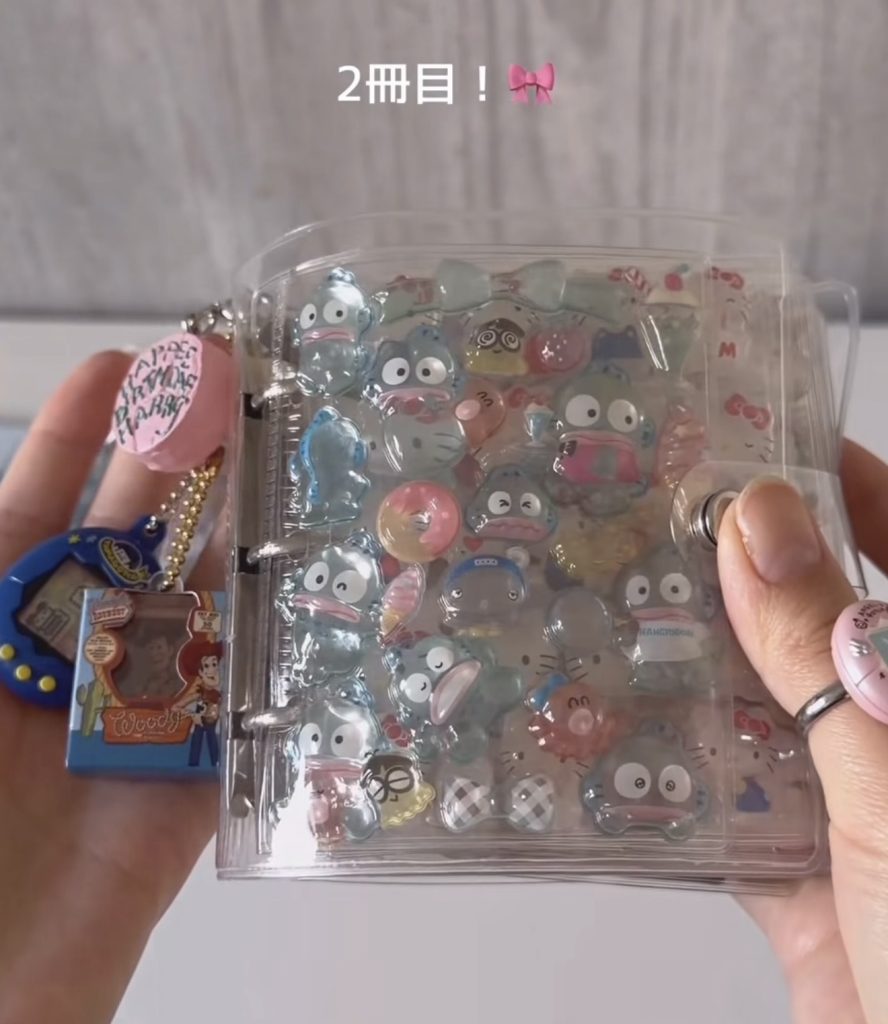 「2025年の夏頃からボンボンドロップシールを集め始め、どんどん増えて、今ではこんなにたくさんに♪ 中のページはキャラクターごとに分けてお気に入りシールをまとめています♡ たまごっちが大好きなのでキーホルダーに付けてみたり♪ 透明シール帳はダイソーの三つ穴バインダー、リフィルはセリアのものです」