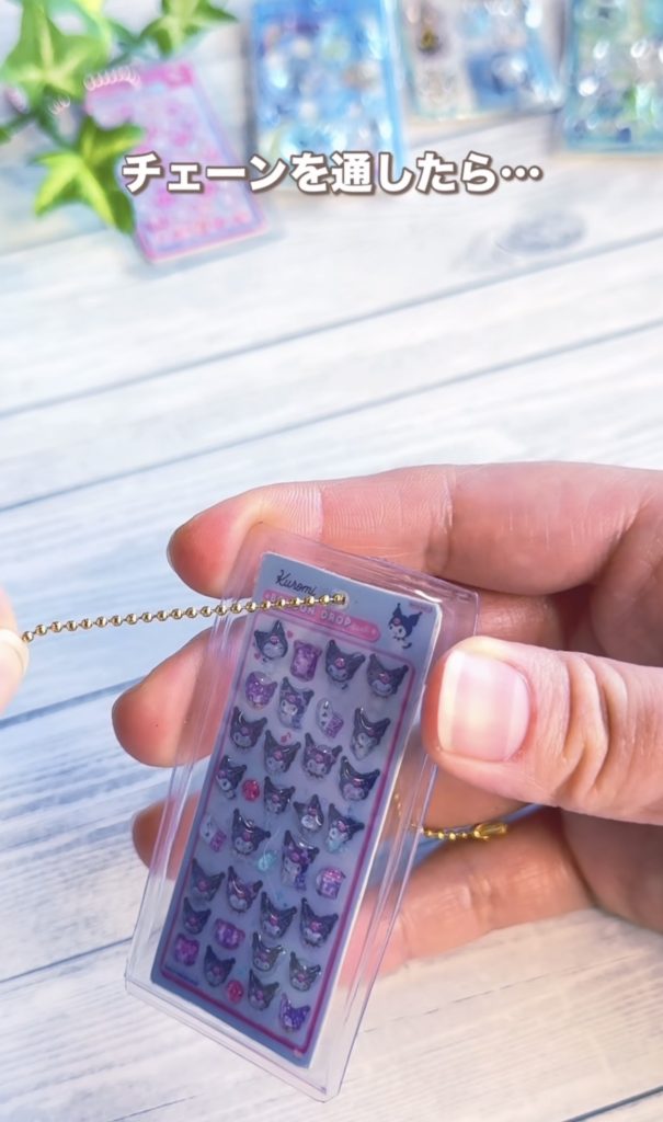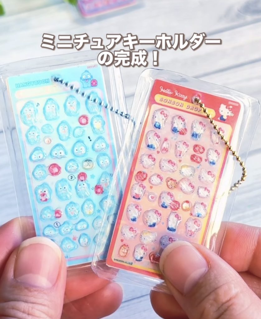 「ミニチュアシールを縮小カラーコピーして、厚紙に貼って周りをカット。軟質カードケースに挟み、周りをヘアアイロンで接着します。冷めたら余分なところを切って、穴をあけてチェーンを通します。これで、ミニチュアシール風キーホルダーの完成です♪ シール帳のストラップとしてつけてもかわいいし、たくさんじゃらじゃらっと持っているだけでも♡気分が上がります~!」